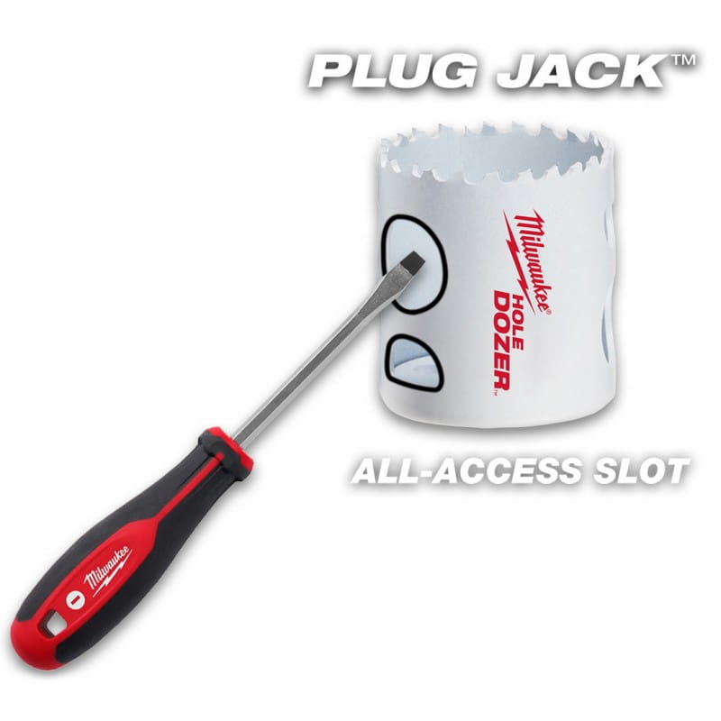 Otwornice Hole Dozer z technologią Plug Jack – specjalna konstrukcja otworów na obwodzie otwornicy, ułatwiające usunięcie urobku pozostałego w korpusie, co pozwala zwiększyć efektywność i wydajność pracy.